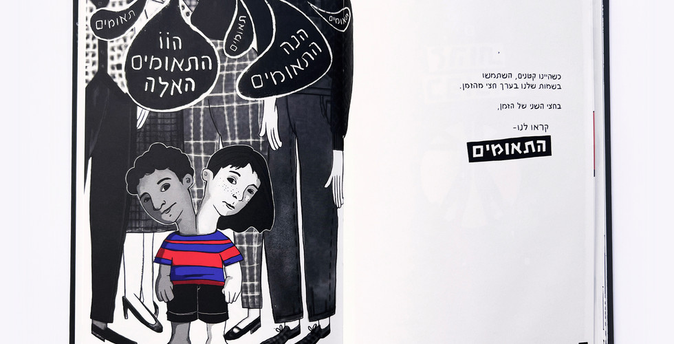 דעת המסקר: בין הפרויקטים המרהיבים בתערוכה. הפרויקט מציג יומן אישי מאוייר בשחור לבן עם קטעים בצבע המספר את הסיפור של החיים של היוצרת לצד אחיה התאום. כל תאום מקבל צבע משלו ותוך כדי הדפדוף הצופה נהנה מחווית קריאה מיוחדת ומשעשעת שכל עמוד בו זה עמוד להתעמק בו מספר דקות ארוכות. השפה האיורית המצויינת, הקומפוזציות, השימוש בחכם בצבעוניות והטקסטים שבאים עם טיפוגרפיה מצויינת שמשלבת כתב יד, הופכות את הפרויקט לאישי ומיוחד שזה בדיוק מה שצריך לעשות בפרויקט גמר. להציג נושא שקל להזדהות ולהבין אותו ולתת עליו עמדה אישית. זה פרויקט שאסור לפספס ונהנתי מכל דקה מצפייה בו.